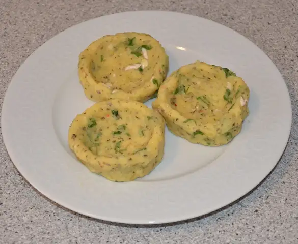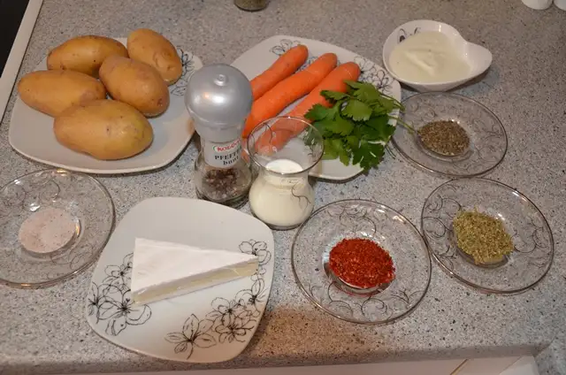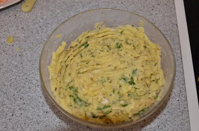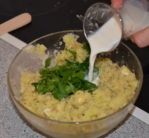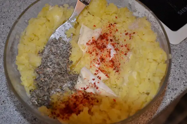 Yapılışı: Haşladığımız patatesleri özenle ezdikten sonra, içine brie peynirini katıyoruz ve patatesler sıcakken ezerek karışmasını sağlıyoruz. Daha iyi ezmek için peyniri küçük parçalara bölebilirsiniz. Bu tarif yine benim kendi hayal gücümle oluşturulduğu için, dilediğiniz peyniri kullanabilirsiniz. Ben her tür peynirle denedim, en güzelinin bu olduğuna karar verdim. Ancak siz kaşar peyniri, yağlı beyaz peynir, krem peynirle de deneyebilirsiniz. Sonra içerisine baharatları, tuzunu ve ince doğradığımız bir tutam maydanozu ekleyip ezmeye devam ederken, içine sütümüzü de katıyoruz. Bundan sonrası bir hayli karıştırmayı ve ezmeyi gerektiriyor.