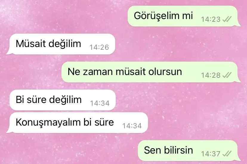 Gayet haklı yani çocukmusun. Sal adamı.1 hafta önce erkek arkadaşımla ayrıldık. Ayrılan taraf bendim. Buluştuk ve buluşmada da bana ilgisiz geldi davranışları o an fevrilikle eve geldim bitirmek isteğimi söyledim. O da sinirlendi birden ne oldu diye. Ayrıldıktan 3 gün Sonra beni takipten çıkarttı. Ben de mesaj attım çünkü daha önce de ayrılmıştık ama hiç böyle takipten çıkma vs. Olmamıştı. takipten çıkmasının üstüne düşman mıyız diye o da “ne alakası var sen ne istediysen onu yapıyorum daha bu konuyu konuşmaya gerek var mı”dedi. Ben de kendimi tutamadım ona seni özledim yazdım pişman olduğumu yazdım. Yazdığı mesaj şu şekilde “Benimle oyun mu oynuyorsun kukla gibi yönetmek mi istiyorsun beni, Önce istemiyorum ayrılalım diyip sonradan seni çok özledim gel diyorsun ve 1 günde düşüncen böyle değişiyor çocuk oyuncağı mı bu “ yazdı. Barışma ihtimalimiz yok mu çok seviyorum onu. Siz ne diyorsunuz bu duruma?