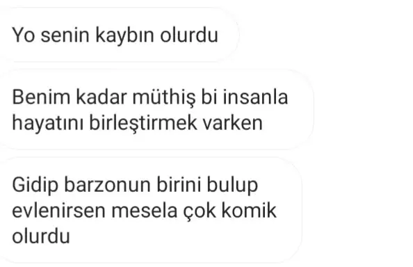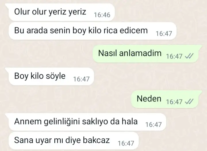 Sonrasında annesi de telde söyledi bunu bana keşke şaka olsa ne diyorsunuz diyemedim susup kapadim işim var diye hahahaBu adamin zekasinda cok ciddi bir sıkıntı yoksa muhtemelen dalga geciyor. Annem gelinligini sakliyor sana uyar mi diye bakacagiz falan acayip egleniyor gibi bir hali var. Esek bile demis saka gibi diyecegim ama belli ki saka ya da kafasi guzel.