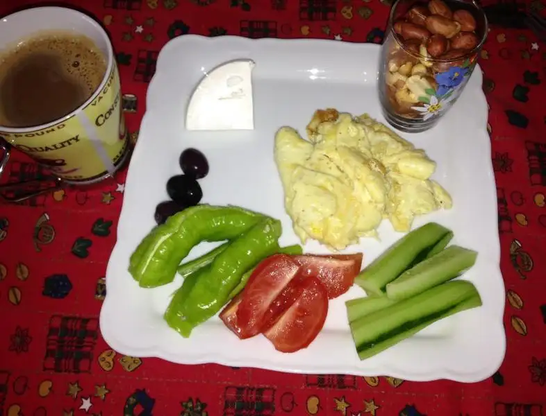 Sabah kahvaltısı geç oldu menemen,peynir,zeytin,domates,2 lokma zeytinyağlı ekmek,badem,kuru kayısı