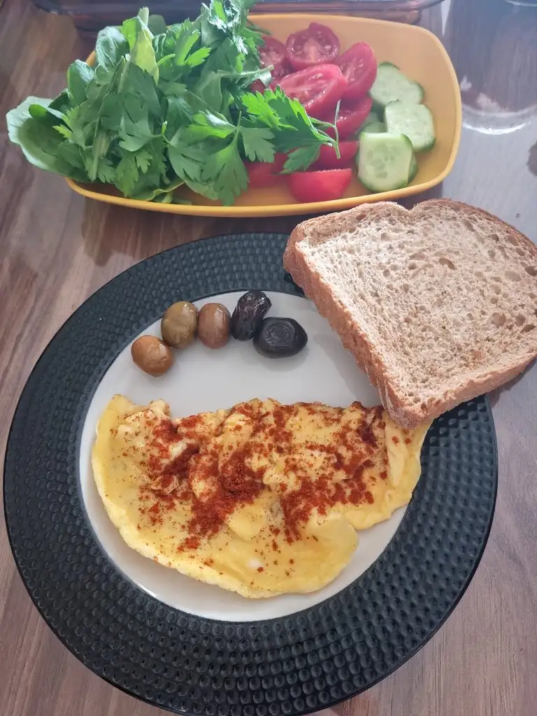 Kahvaltı 10.00 Biberli soğanlı omlet 1 dilim ekmek 1 kk peynir Ara Kahve 2 gün kurusu 1 kare bitter 1 yarın cokoprens Akşam 18.30 1 tabak kabak yemeği 1 tabak salata 4 kaşık yoğurt Çeyrek Maraş çöreği