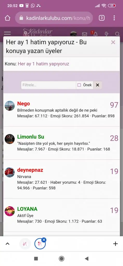 Nick olarak aratıp bakabilirsiniz yada listede çıkıyor. Örnek limonlu su nickli arkadasımızın 28 mesajı varmış bu konu içinde 28 rakamına tıklayıp tüm mesajlarını en son ki mesajını bulabilirsiniz bu sekilde.Cok kullanıslı bir özellik. Aklınızda bulunsun diye ekledim canlar![]()