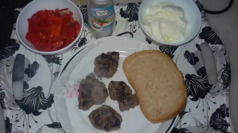 akşam : ızgara köfte , 2 dilim kızarmış ekmek , yarım kase yoğurt , domates (hala çok açım ekmeği 1 dilim fazla yememe rağmen)