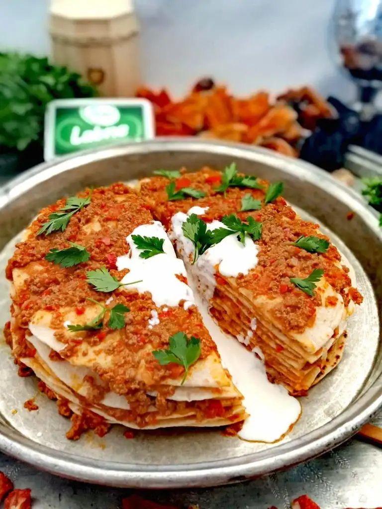 Hayran kalacağınız,kat kat yufkaların arasında nefis kıymalı sosu ve üzerine sarımsaklı yoğurt eşliğinde sizi star yapacak eşsiz bir yemek