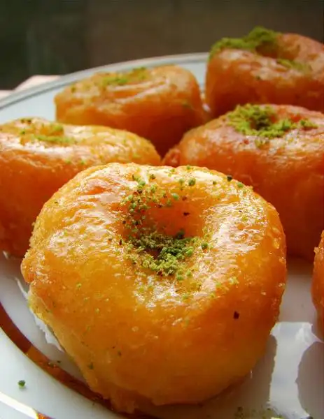 Ayçiçeği yağını iyice ısıtın. Hazırladığınız hamurları bu yağda kızartıp soğuyan şerbete atın. 5-6 dakika sonra şerbetin içinden alıp toz Antep fıstığı ile süsleyip servis yapın.