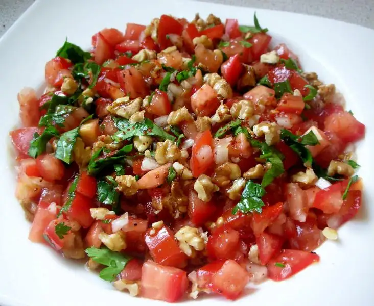 - Yeşil soğanlar ve maydanozlar da çok ince kıyılır. Bütün malzeme geniş bir kaba alınır, iri kırılmış cevizler, zeytinyağı ve nar ekşisi ilave edilir.