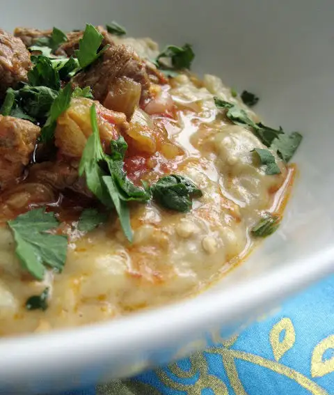 - Soğanları ve sarımsakları doğruyoruz. Kuzu etini de kuşbaşı doğruyoruz. Tencereye sıvıyağ koyuyoruz. Soğan ve sarımsağı soteliyoruz. Kuşbaşını ilave ediyoruz ve sotelemeye başlıyoruz. Domates salçasını ekliyoruz. Kavurduktan sonra sıcak su veriyoruz.