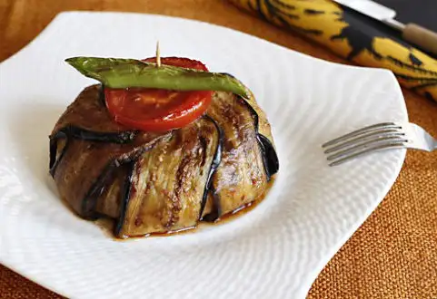 Servis tabağına üç patlıcan dilimini aralarına et ilave ederek üst üste yerleştirin. Üzerine hazırladığınız pesto sosu gezdirin. Diğer patlıcan kulelerini de aynı şekilde hazırlayın. Domates dilimi ve mısırla süsleyip sıcak veya ılık servis yapın.