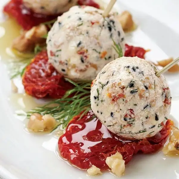 - Rendelenmiş beyaz peyniri geniş bir kaseye alın. İçine çörek otu, doğradığınız kurutulmuş domatesi, ince çekilmiş ceviz içini, dereotu ve sızma zeytinyağını ekleyip karıştırın. Elinizle cevizden biraz küçük toplar yuvarlayın.