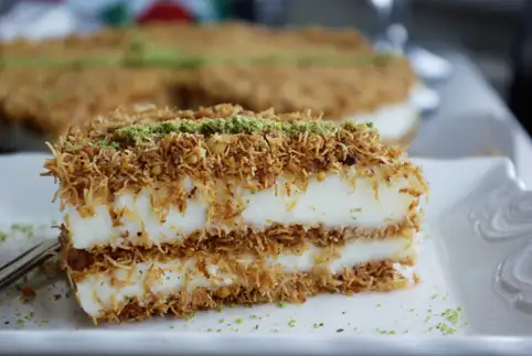 - Kadayıfın yarısını büyük dikdörtgen borcama serin. Üzerine muhallebiyi yayın. Kalan kadayıfı da serin.