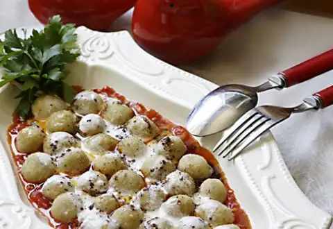 - Pişen sosu servis tabağının altına yayın, haşladığınız köfteleri üzerine dizin. Yoğurdu ezilmiş sarımsak ve yarım çay kaşığı tuz ile özleştirin ve köftelerin üzerine yayın. Üzerine sumak serpin, kızdırılmış tereyağı gezdirin.