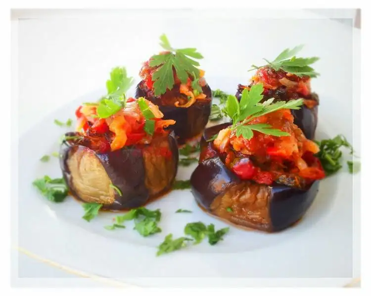 - Yarım kesilmiş çeri ve biber parçasını kürdana geçiriyoruz, patlıcanların ortasına batırıyoruz. Cam fırın kabına diziyoruz. Tencerede kalan sosu üzerine gezdirerek döküyoruz. Önceden ısıtılmış 180 derecelik fırında pişiriyoruz.