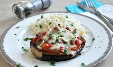 - Suyu kıvamlı bir sos haline gelene kadar pişiriyoruz. Pişen etli harcı patlıcanların içlerine paylaştırıyoruz. Üzerlerine bir dilim domates koyuyoruz. Bir fesleğen yaprağı ve kaşar peyniri rendesi koyuyoruz. Tekrar fırına veriyoruz ve kaşar eriyene kadar pişiriyoruz.