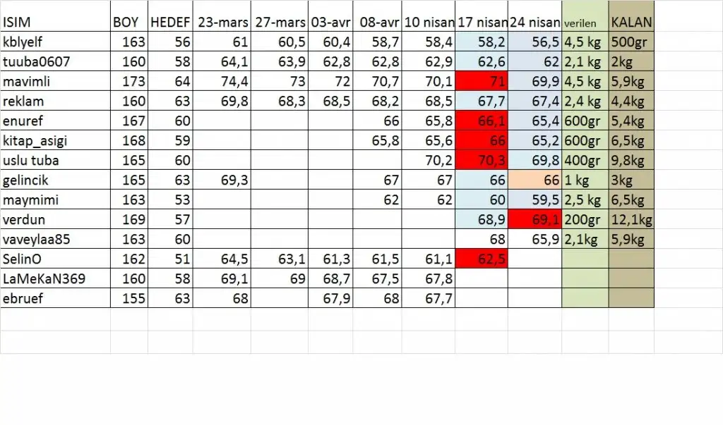 160 cm 65 ile basladim 9 martta. simdi 62 .cok yavas veriyorum ben nedense.diger bazi arkadaslar bayaa verdi.330.sayfada tablomuz var bakabilirsinsenin boy kg kaç canım ? Bu başlık ile kaç kg gitti ?