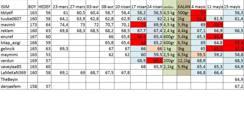 Olsun canim benim icin sorun degil. Hak ettim o kirmiziyi. Ders olsun banaHee canim ben cuma yazilanlari not ettim. yoksa kitap asigi 1.5 kilo vermis cumadan beri ama tabloda kirmizi