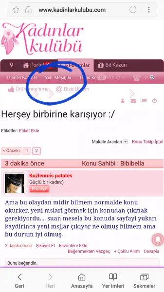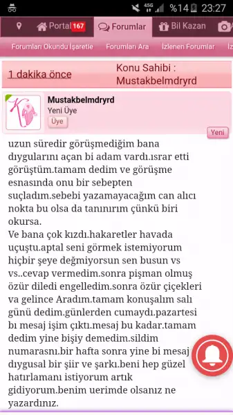 valla bende de karışık bi tık yukarı kaydiribca düzeliyor ... 17 .sayfayi okuyorum örneğin yeni msj sekmesi yoktu ya 17 sayfa geri gitmem ya da forumlara tekrar tıklamam gerekiyordu şimdi en azından yukarı kaydirinca yukarda yeni msj sekmesi..Dediğini ne anlamadım bende olmuyor heralde ben yeniliyordum sayfayı çıkmaya gerek yok veya zaten sürekli yeni mesajlara basardım zaten bildirime göre geziyorum forumda :)