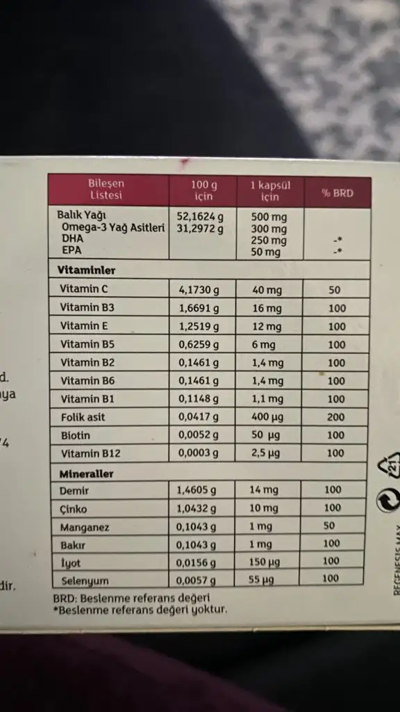 Şuan folik asit kullanıyorum içerisinde omega 3, b12 ve bisürü vitamin var. Bak atayım ekleyeyim fotosunu