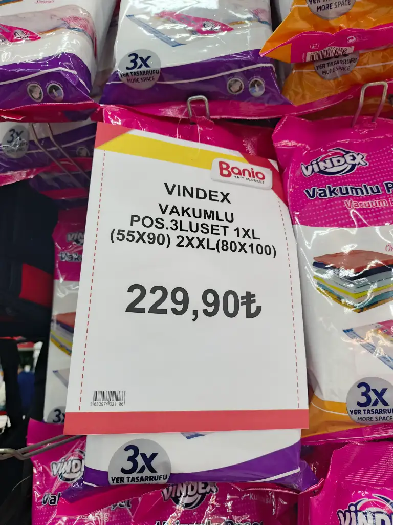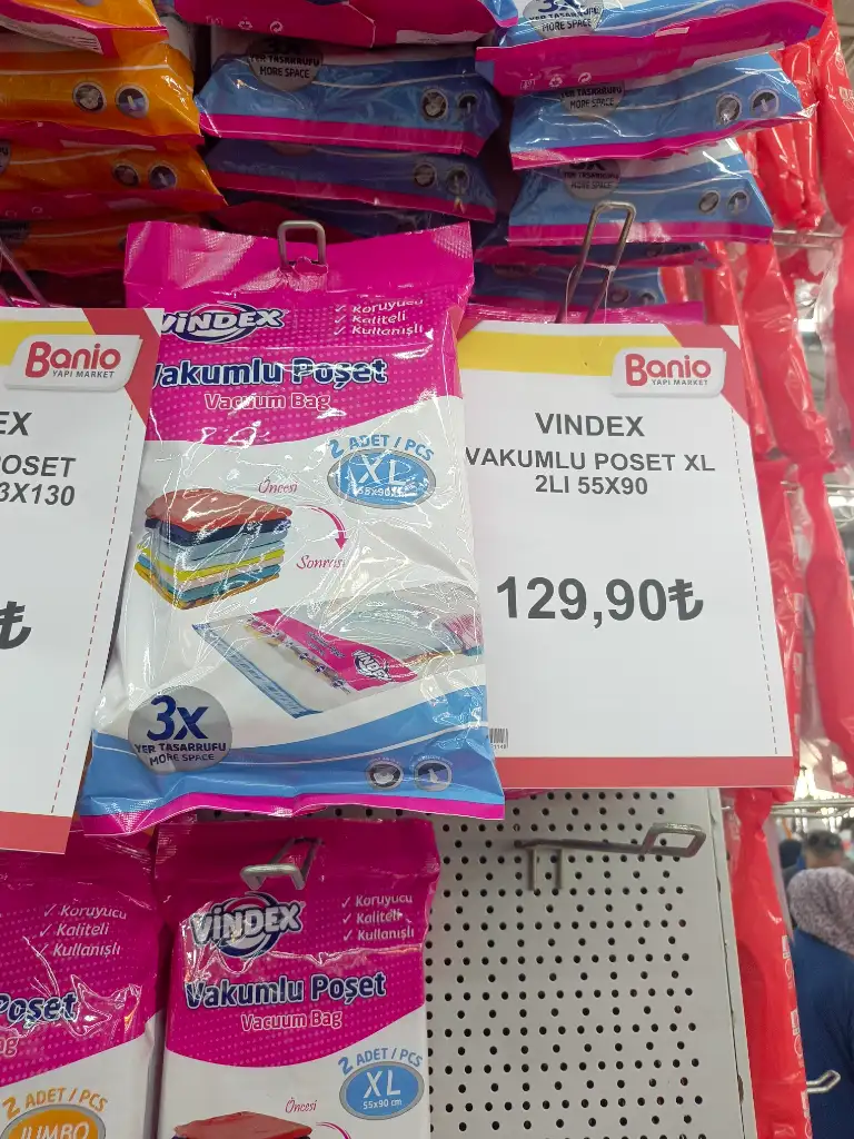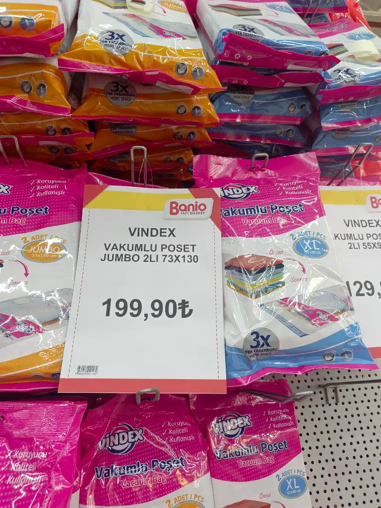 Vakumlu hurcu çok pahalıya almışım bugün eve dönerken Bursa'da yeni açılmış bir yapı markete uğradık bu fiyatları görünce şok oldum ben büyük boy vakumlu hurcu 250 TL ye almıştım üçlü paketin 229.90 TL olanından aldım. Üç gündür yatak odasında derleyip toplama işlemi yapıyorum düzeni seviyorum vakumlu hurçlar da yerden tasarruf sağladı.