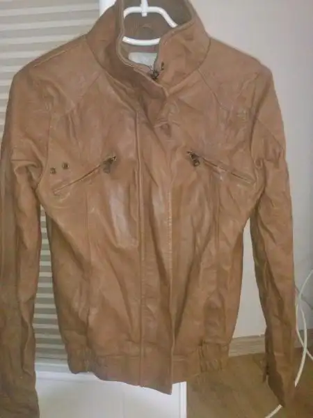 4. ürünüm deri ceket: kahverengi lets go marka deri ceket...modeli hafif kırışıktır..125 liraya çok beğenerek aldım small bedendir fiyatı 45 lira.. çok az kullandım tek sorunu kol düğmelerinden iki tanesi koptu..