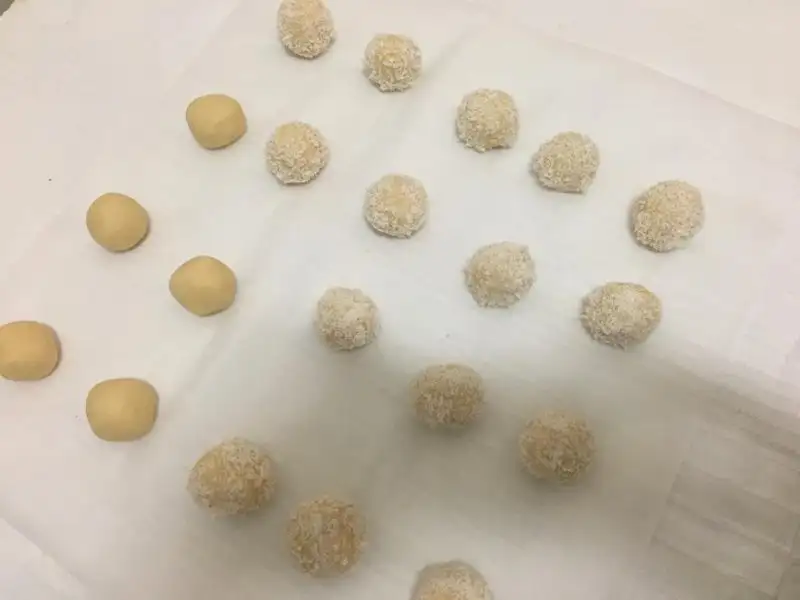 2. Kurabiyelerimizi şekillendirelim. Hamurdan küçük bezeler koparıp elinizle yuvarladıktan sonra önce ayırdığınız yumurta akına sonra da kalan Hindistan cevizine batırılıp tepsiye dizin.