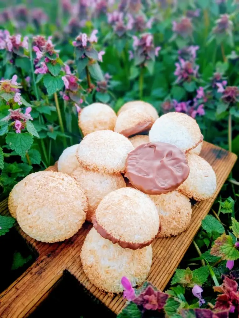 Üç yumurtamızın beyazlarını ayırıp mikserle güzelce çırpıyoruz. İyice krema kıvamına geldiğinde şekerimizi ve vanilini ekliyoruz. Biraz daha koyu kıvama gelip şeker tamamen eridikten sonra hindistan cevizini ekleyip spatula ile karıştırıyoruz. İyice karıştığından emin olabilmek için elinizle şekil alıp almadığına bakabilirsiniz. Harcımızı 10 dakika buzdolabında dinlendirip arzu ettiğimiz gibi şekil verdikten sonra 180 derece ısınmış fırında 4-5 dakika (kurabiyeler kızarana kadar) pişiriyoruz. İlk sıcaklığı geçtikten sonra dilerseniz benmari usulü eritilmiş Ülker çikolataya bandırıp çikolatalar soğuduktan sonra servis edebiliriz. Veee sonuç; ağızda dağılan pofuduk kurabiyeler!
