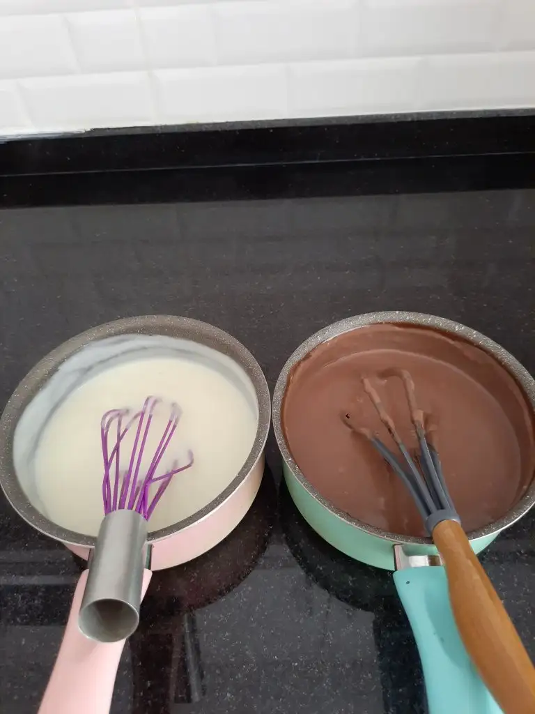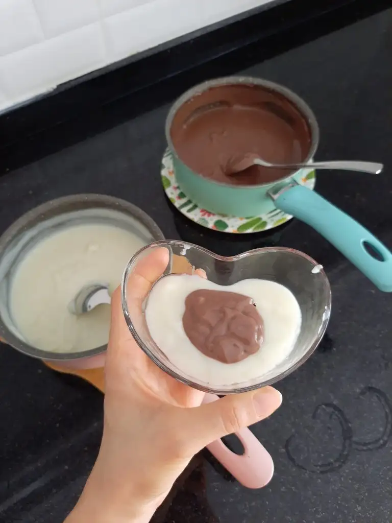 Daha sonra muhallebileri birlestirecegimiz kaplari sudan geçirelim. Bir kaşıkla bir kakaolu bir sade muhallebiden alıp kapları dolduralim.