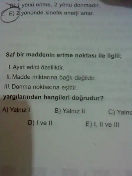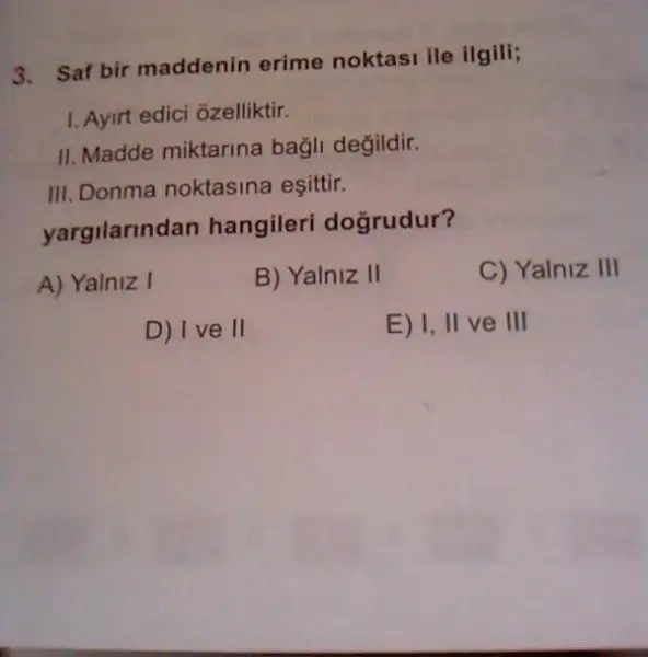 2.soruda Erime noktası ayır edici bir özelliktir, madde miktarına bağlı değildir 1 litre suyun da 1 ton suyun da erime noktası aynı sıcaklıktır, erime zamanı fark eder sadece,erime noktası donma noktasına eşittir, su için mesela sıfır derecedir, bu noktada hem buz hem su bulunabilir.