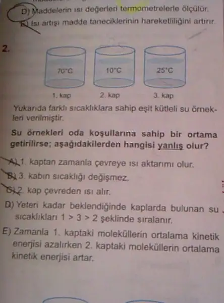 3.soruda yeteri kadar bekletilirse hepsinin sıcaklıkları eşit olur. 100 derecede 0 derecede ve 25 derecede suyu bir odaya koy bırak 2 gün geldiğinde hepsinin sıcaklıkları eşit olur. Bu şekilde düşünebilirsin, kimya için basite indirgemek genelde doğru sonuçlar verir.