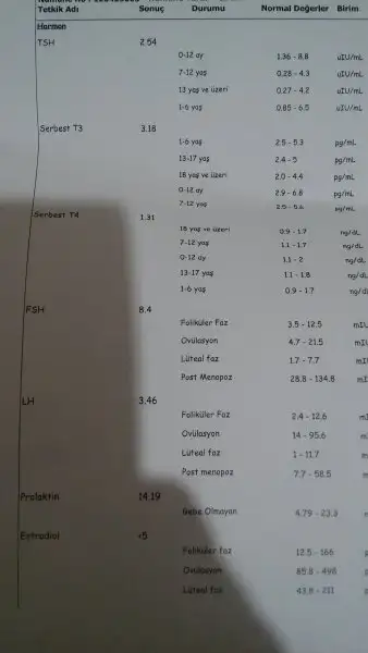Estradiol hormonun evet simdi dikkat etyim dusuk gibi duruyor canim benimki de cok yuksek cikmisti doktor bu hormonu düşürmeliyiz yumurtlamayla alakali bi hormin demisti. 63 cikmisti benimki normalde 50 civari fln olmali galiba ama yine de en uyi yonlendirmeni doktorun yapar canm bnm stres yapma