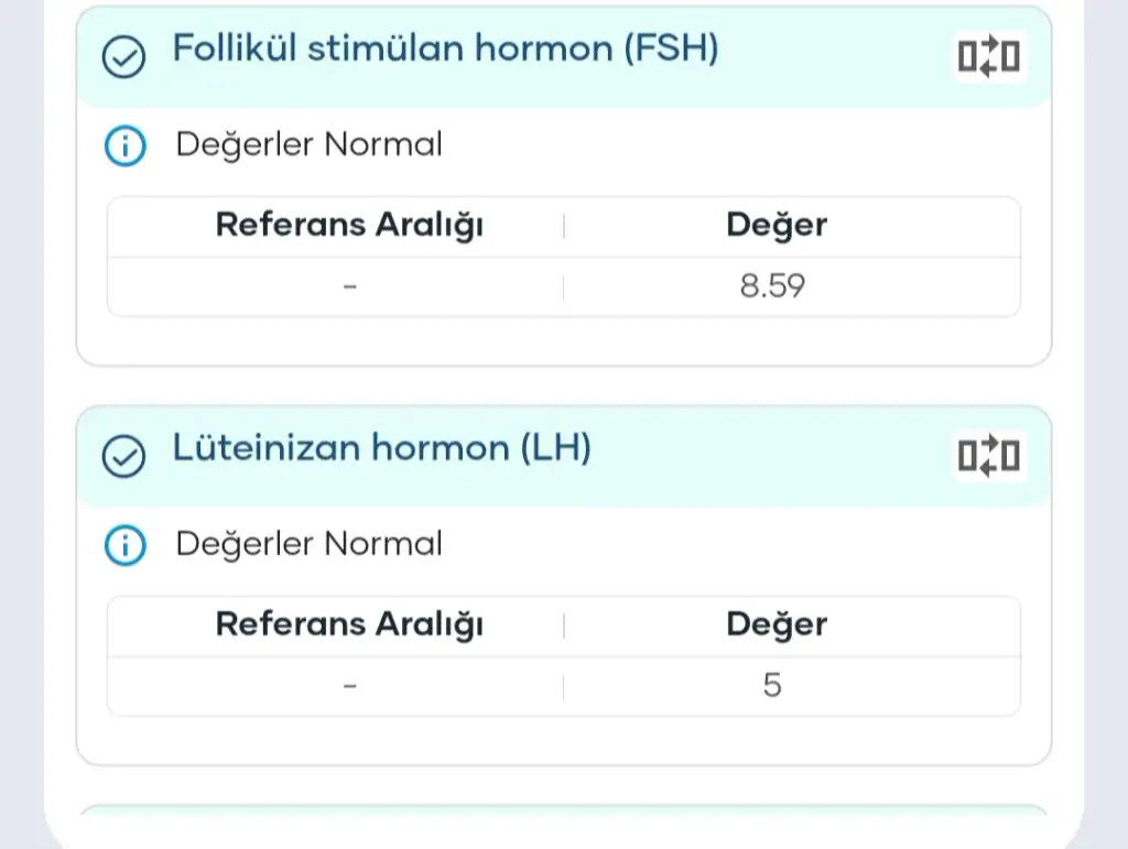 • FSH (Folikül Stimülan Hormon): 8,59 mIU/mL biraz sınıra yakın, ama genellikle bu değer normal-orta düzeyde kabul edilir. FSH'nin yüksek olması yumurtalık rezervinde azalma göstergesi olabilir ama sizin AMH’niz yüksek olduğu için bu dengeleyici bir durum olabilir.