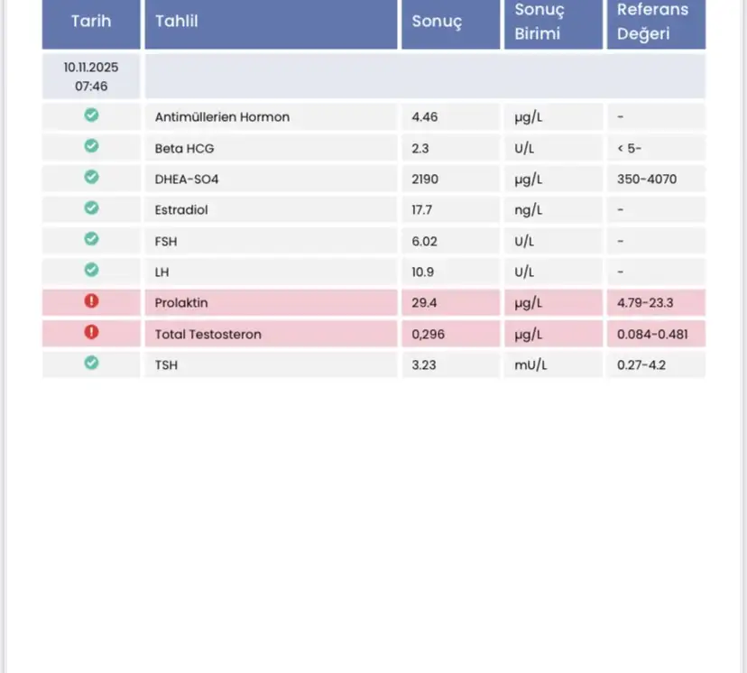 Kızlar benim amh 4,46 normal değer olarak kabul edilmiş tüm değerlerimde normal değer yazıyor bu ikisi referans dışı gözüküyor ama alttaki referans aralığında anlayan var mı yeni kimyasal gebelik geçirdim prolaktin o yüzden biraz yüksek çıkmış olabilir mi perşembeye randevum var bilen birisi yardımcı olabilir mi