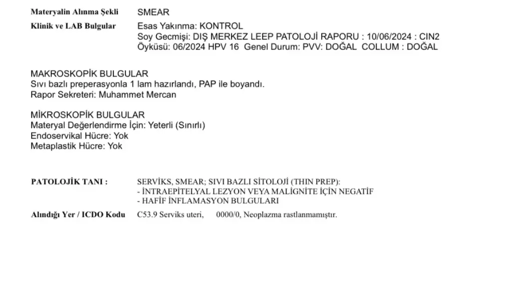 Yaklaşık 5 sene kadar önce Hpv 16 pozitif tanısı kondu ve zamanla hücreler oluştu tabii ki. 2024 Haziran ayında leep operasyonu geçirdim. 2024 Aralık ayında da kontrol amaçlı tekrardan Smear testi verdim ve sonucum ekte ki gibidir. Lütfen sizlerden ricam anlayan, bilen yorumlayabilir mi, daha randevuma çok var ve acaba tekrardan hücreler yenilendi mi çok kaygılanıyorum haliyle. Gerçi hücre yok diye yazılmış ama işte hiç anlayamadığım için şu anda bir nebze de olsa aklımda ki soru işaretlerinden arınmak istiyorum sayenizde. Gerçekten bir dolu zaman daha beklemek çok zor randevuma kadar. Değerli yorumlarınızı paylaşırsanız çok memnun edersiniz beni. Şimdiden çok teşekkürler ediyorum. 🙏💐🤍