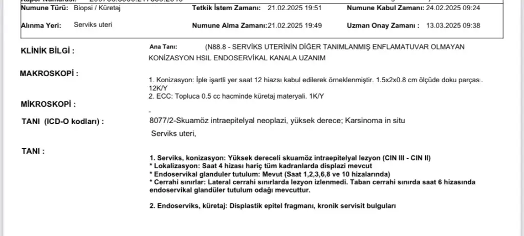 Öncelikle kolposkopi ve gerekiyorsa biyopsi yapıyorlar. Eğer sonuçlarında cin2 veya cin3 çıkar ise o zaman rahim ağzından o riskli dokuyu alıyorlar. Ben ahcc takviyesine başlayacağım. Kullanacağım takviye ismi virefekt. Eczacınız sipariş verebilir.