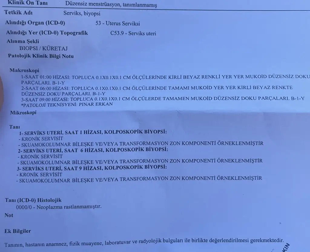Evet hocanın tecrübesi yılların tecrübesi, sanki resmen gözleri patoloji değil mi?Aynen soğuk konizasyon deniyor bu işleme leepin daha kapsamlısı bunun yapılması için adenokarsinoma in sitü diye bir evre var kanser oluşum ancak daha emekleme aşamasında gibi demekmiş. Uğur hocaya gitmediğim dönemde yaptırdığim biyopsi sonucu öyle gelmişti. Hemen uğur hocaya koştum kolposkopide anladı kanser olduğumu adam ama yinede gönderelim allah bilir demişti. Kritik nokta bu kızlar nen uğur hocayı bırakmasaydım benim ağustos ayında kanser oluşmuşsa belli olurdu. Ona gitmediğiö için ben 4 ay bekledim boşa. Ondan diyorum tecrübeli hekim çok önemli