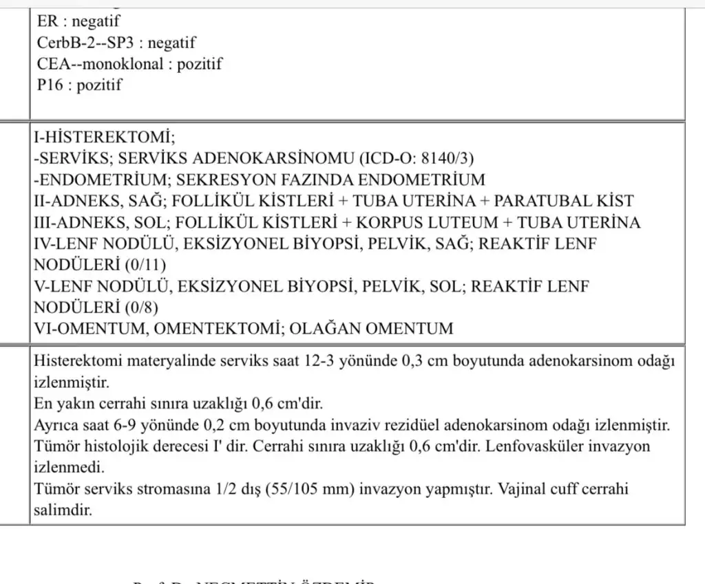 Merhaba ben de rahim korumalı trakelektomi oldum yaşımdan dolayı 29 yaşındayım, tür Adenokarsinom 1.8cm, ameliyat sonrası patolojimde Lenfovasküler invazyon olması sebepli ekstra radyoterapi önerdiler önlem amaçlı ama istemedim, takip istedim.. Sizin ameliyat sonrası patolojiniz nasıl geldi benimle paylaşabilir misiniz?