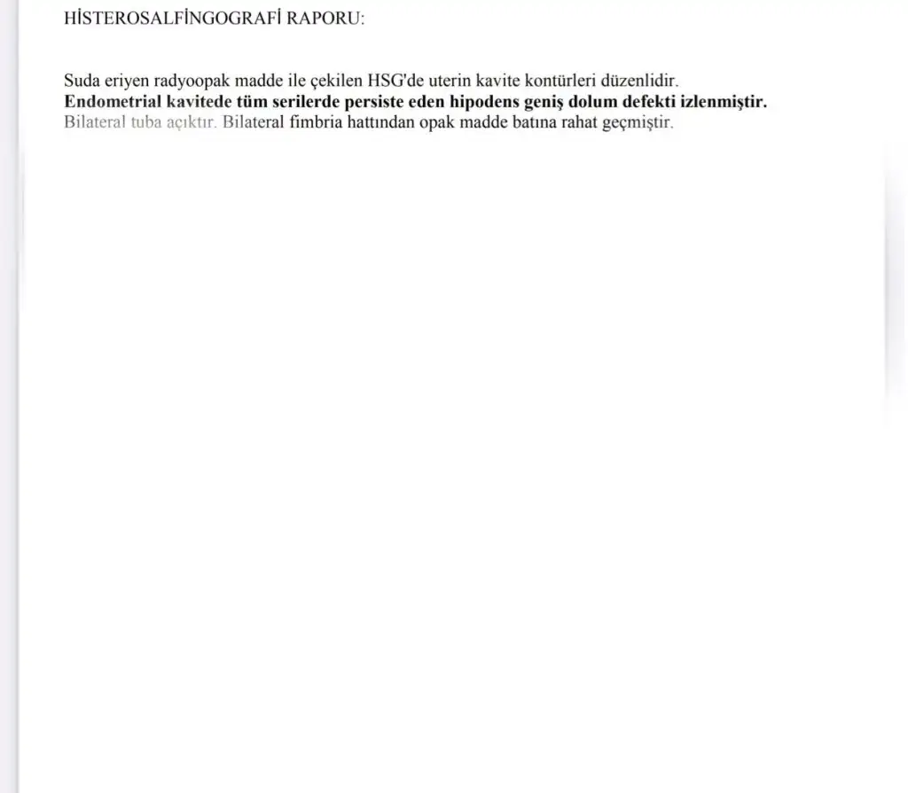 İyi akşamlar kızlar. Bilgisi olan varsa yardımcı olursa çok sevinirim. Bugün tüp bebek öncesi hsg çektirdim. Tıkanıklık, şekil bozukluğu vs yok ama koyu şekilde yazan kısmı anlayamadım. Başına gelen bar mı bu durumda ne yapmalıyım. Çoğu kişi transferler negatif olması durumunda histereskopi yapılmasını yazmış sizce öyle mi yapmalıyım tabi doktoruma daha danışmadım şimdiden teşekkürler