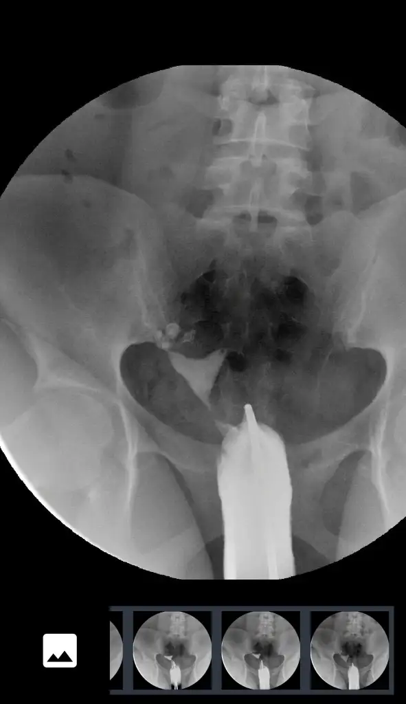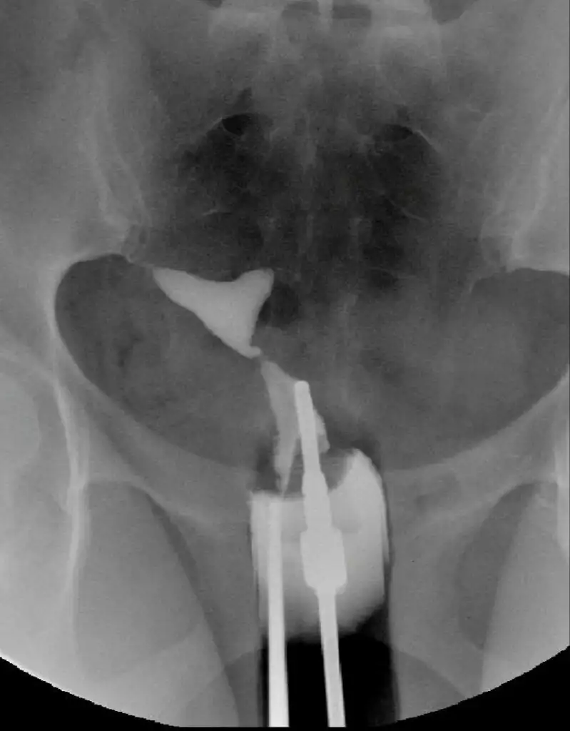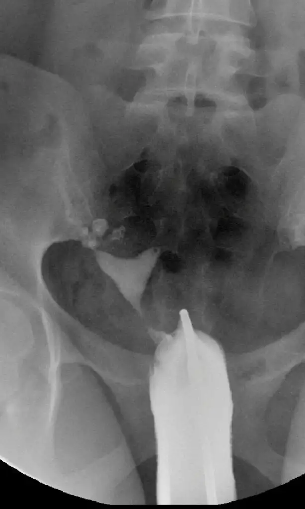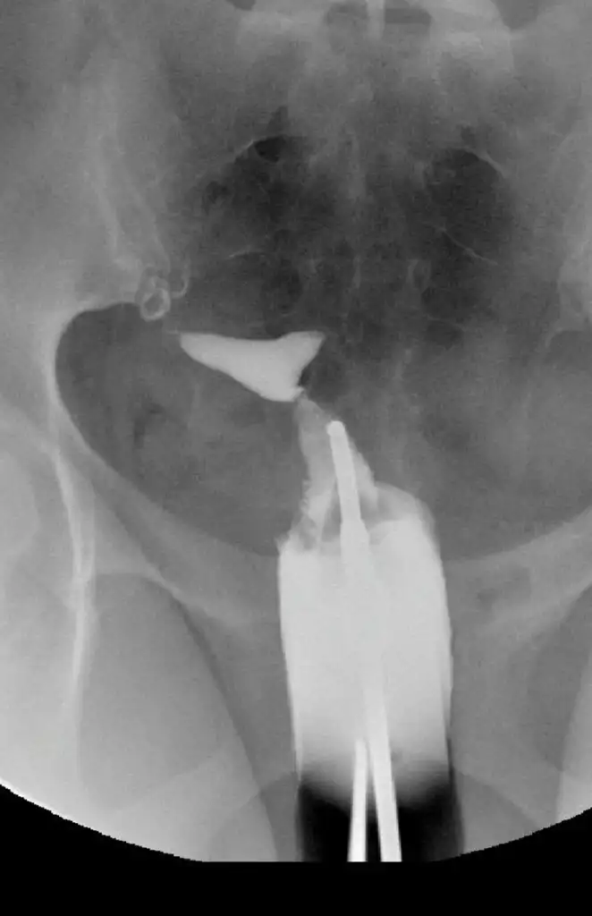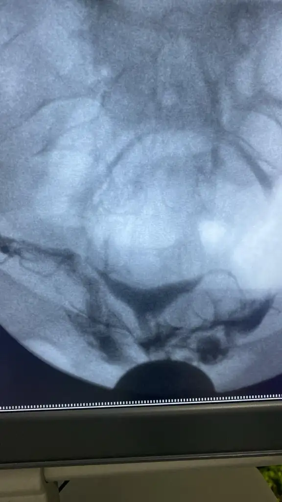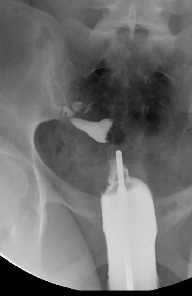 • Sağ tüp (görüntünün sol tarafı): Kontrastın bu tarafta geçip geçmediği net değil, opasite fazla olabilir ya da tıkanıklık olabilir. Ek görüntülerde akış varsa değerlendirme değişebilir.
