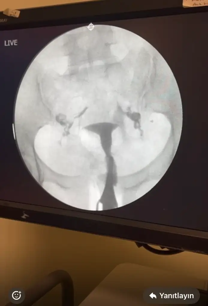 • Görüntüde kontrast maddenin fallop tüplerinden karın boşluğuna net bir şekilde döküldüğü (spill olduğu) açık şekilde seçilemiyor. Bu, görüntü açısına veya kontrastın henüz tüplerden geçmemiş olmasına bağlı olabilir, ya da tüplerden biri/birkaçı tıkalı olabilir.