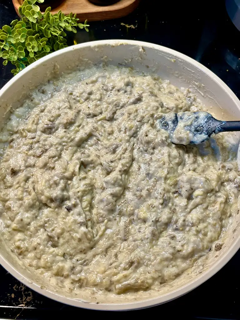 4. Közlenmiş patlıcanları ekleyin, karıştırın.