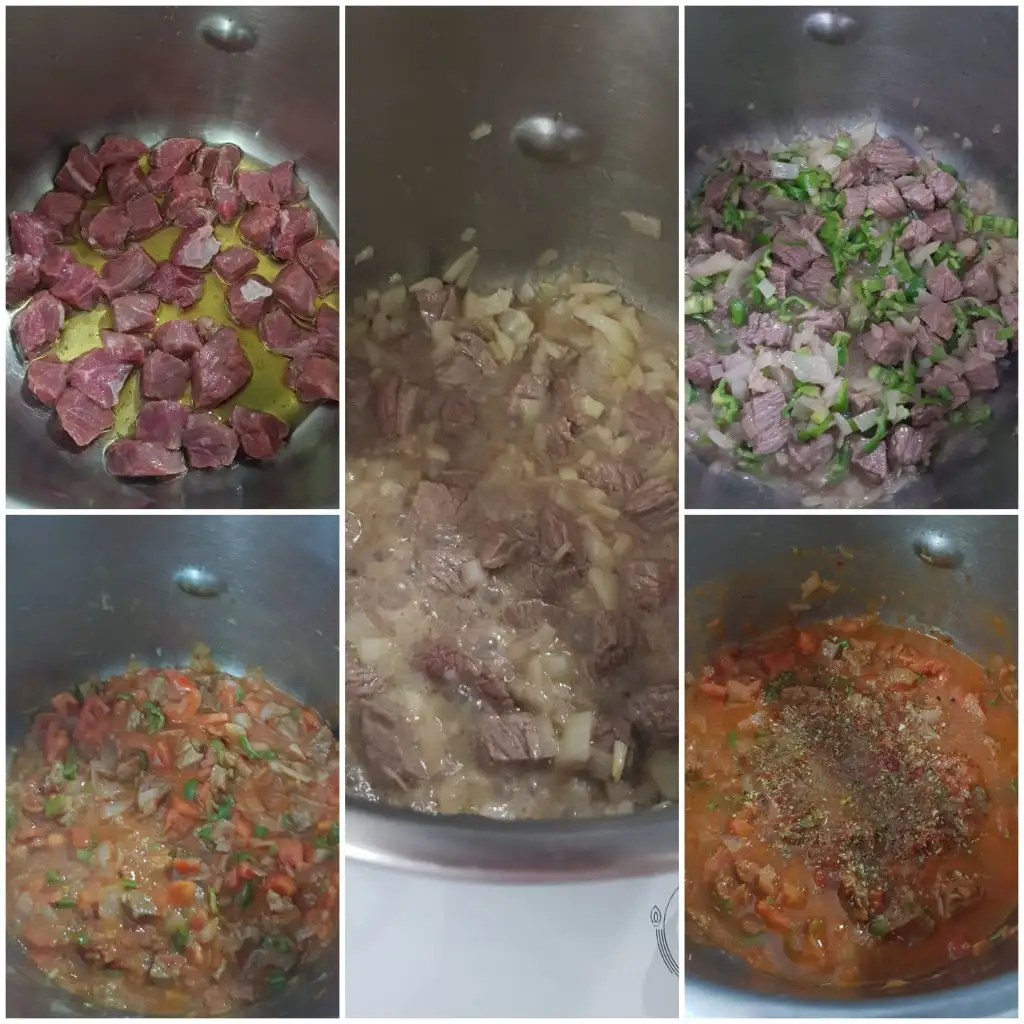 • Tencereye etler ve zeytin yağı konur ve etler suyunu bırakıp çekene kadar kavrulur. ( Ben, düdüklü tencere kullandım, siz normal tencerede yapabilirsiniz. )