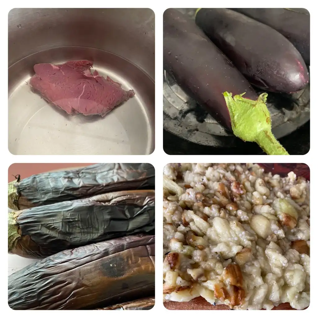 Öncelikle etimizi bir litre su ile haşlıyoruz.Etimiz haşlanırken, patlıcanlarımızı közleyip ,soğuduktan sonra soyup doğruyoruz.Haşlanan etimizi de suyundan alıp soğuduktan sonra didiyoruz.Eki Görüntüle 3006838