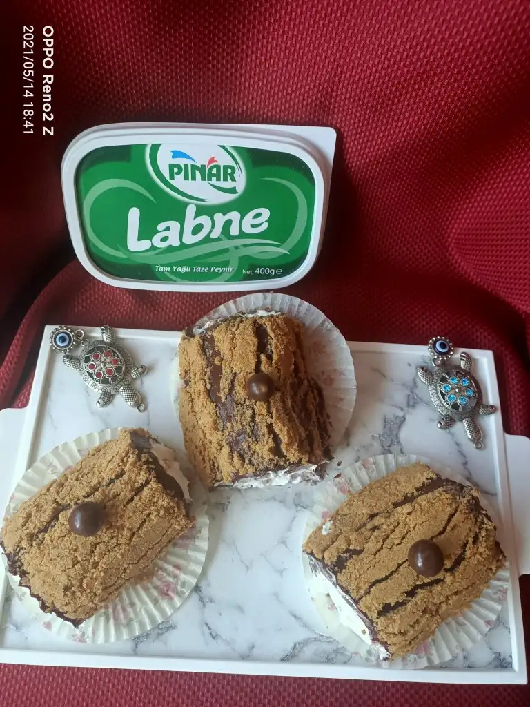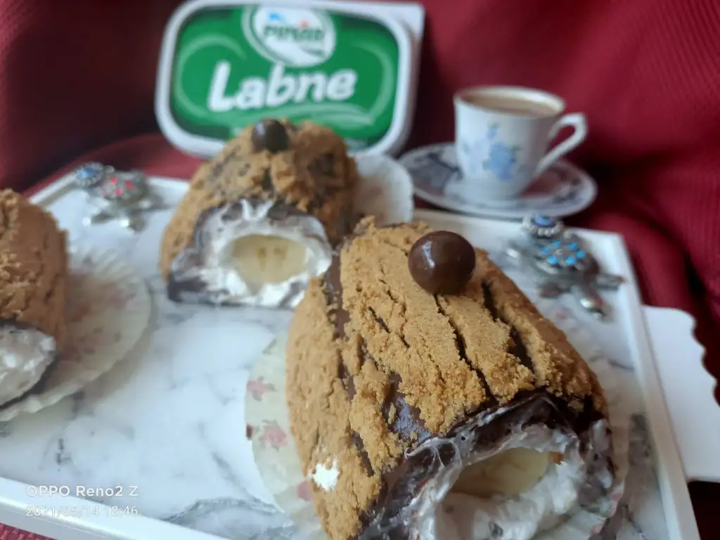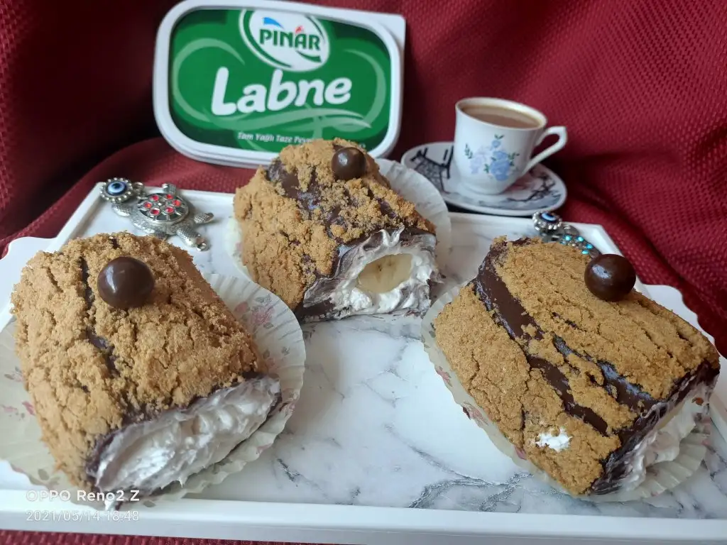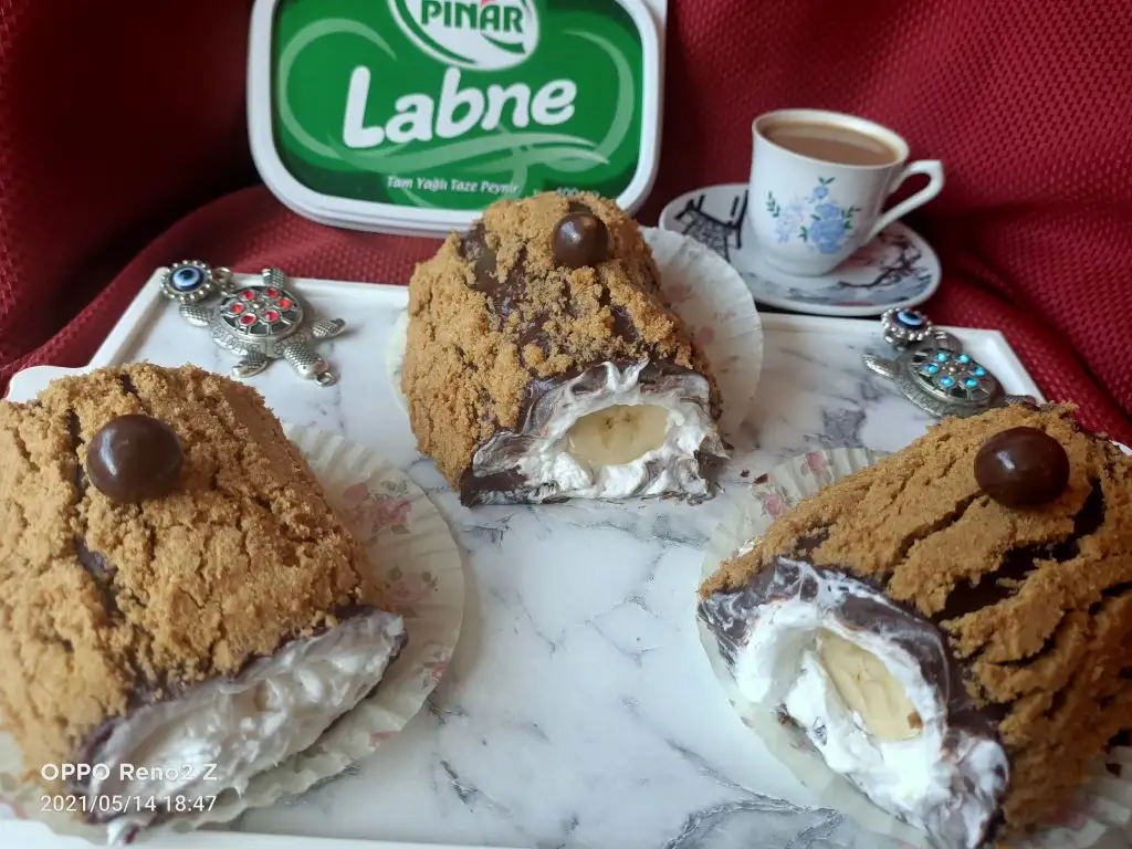 Öncelikle bisküvileri rondodan geçirip tepsiye bir bardakla bastırarak yayıyoruz. Süt, şeker ve unu karıştırıp ocağa alıyoruz. Koyulaşana kadar karıştırarak pişiriyoruz. Ocağın altını kapattıktan sonra damla çikolata, tereyağı ve vanilini ekleyip karıştırıyoruz. Beş dakika kadar sıcağının geçmesini bekleyip tepsiye eşit şekilde yayıyoruz. Bu şekilde soğuyana kadar bekletiyoruz. Bu arada krem şantimizi pınar labneyi de ekleyip çırpıyoruz. Soğuyan muhallebinin üzerine yayıyoruz ve mümkünse 1 gece dolapta bu şekilde bekletiyoruz. Bekleyen tatlımızı kesiyoruz ve arasına muz koyup sarıyoruz. Hemen servis edip bu güzel lezzeti tadıyoruz. Afiyet olsun.