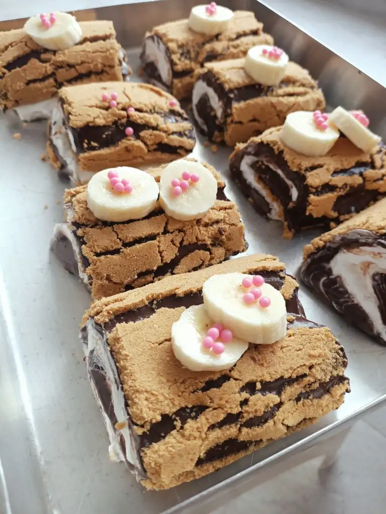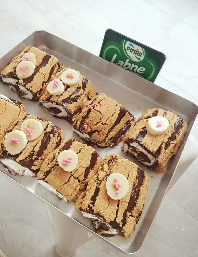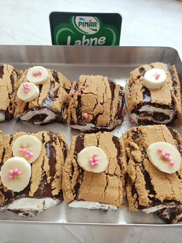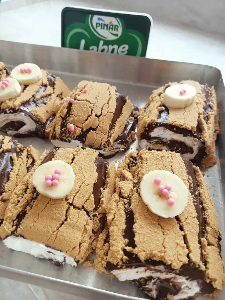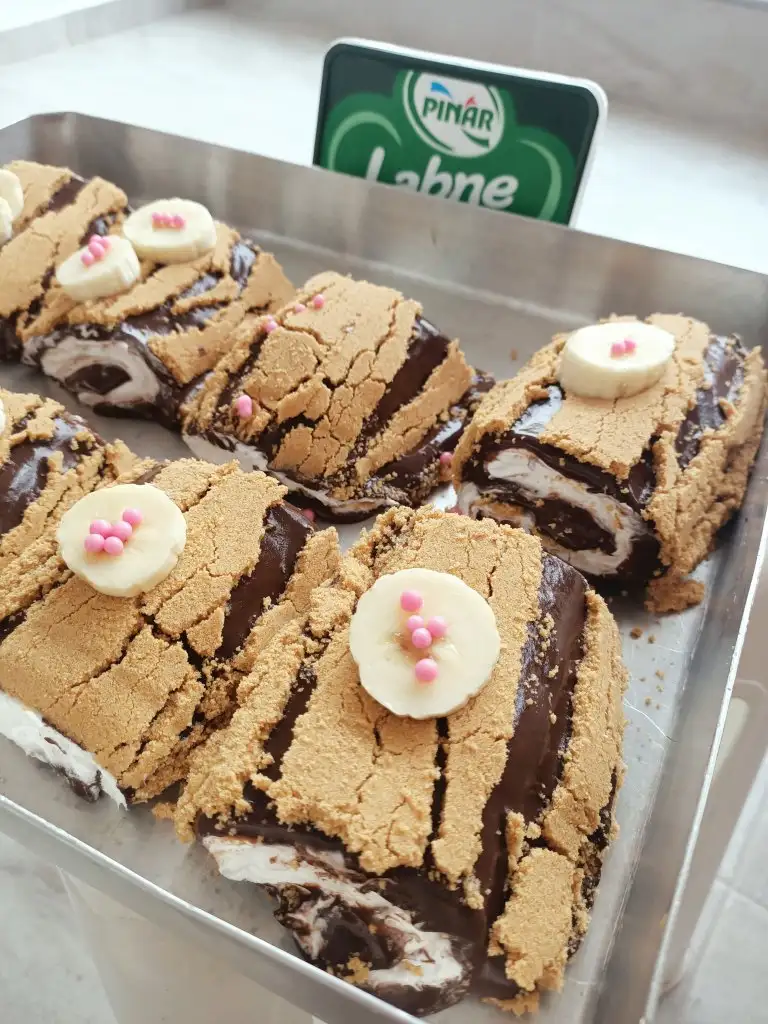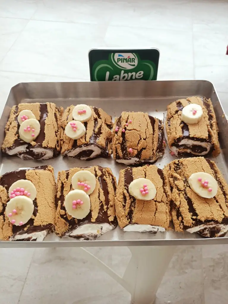 Bisküvileri rondodan geçirip fırın tepsisine eşit şekilde bastırarak yayıyoruz. Muhallebisi için tereyağı, damla çikolata, vanilin hariç diğer malzemeleri temcereye koyup pişiriyoruz. Ocağın altını kapatınca geriye kalan malzemeleri ekleyip karıştırıyoruz. Birkaç karıştırıp ilk sıcağı çıkınca tepsiye yayıyoruz ve soğuması için bekletiyoruz. Bu arada krem şantiyi çırpıyoruz, en son labneyi ekleyip bir tur daha çırpıyoruz. Soğuyan muhallebinin üstüne krem şantiyi yayıyoruz. Kesip rulo yaparak yuvarlıyoruz ve afiyetle yiyoruz.