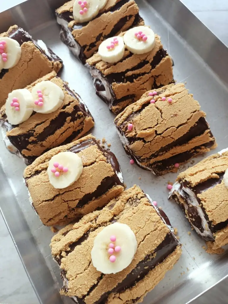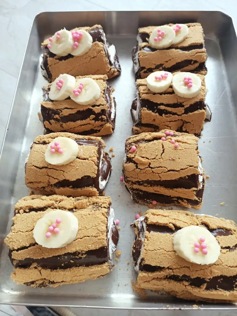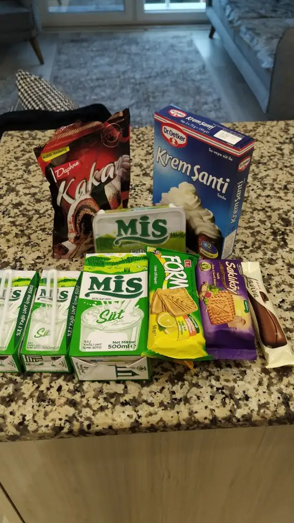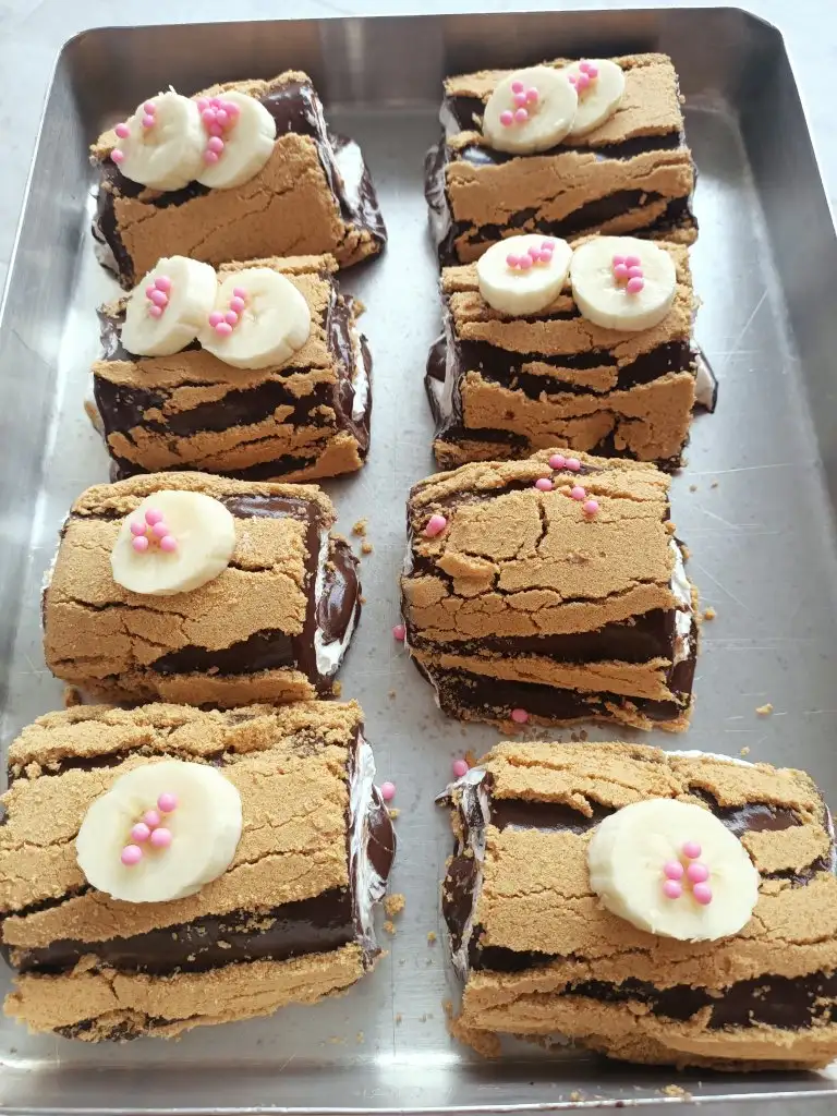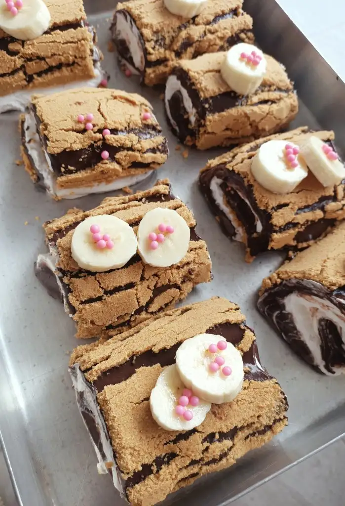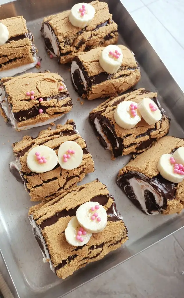 Bisküvileri rondodan geçirip fırın tepsisine eşit şekilde bastırarak yayıyoruz. Muhallebisi için tereyağı, damla çikolata, vanilin hariç diğer malzemeleri temcereye koyup pişiriyoruz. Ocağın altını kapatınca geriye kalan malzemeleri ekleyip karıştırıyoruz. Birkaç karıştırıp ilk sıcağı çıkınca tepsiye yayıyoruz ve soğuması için bekletiyoruz. Bu arada krem şantiyi çırpıyoruz, en son labneyi ekleyip bir tur daha çırpıyoruz. Soğuyan muhallebinin üstüne krem şantiyi yayıyoruz. Kesip rulo yaparak yuvarlıyoruz ve afiyetle yiyoruz.