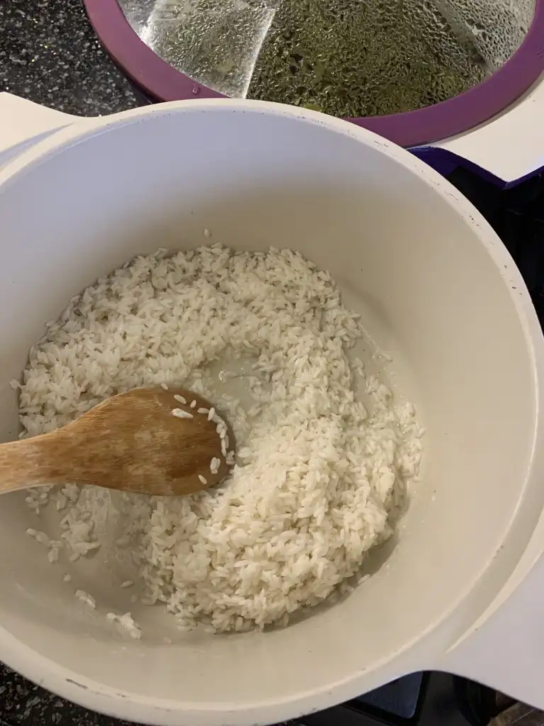 Üzerine 2 su bardağı sıcak su ilave edilir.Tuzu ayarlanır. Pişmeye bırakılır.Pilav suyunu çekinceye kadar pişirilir. Bu ölçüdeki pirinç için suyu bilerek az kullanıyoruz, pilavımız biraz diri kalacak.