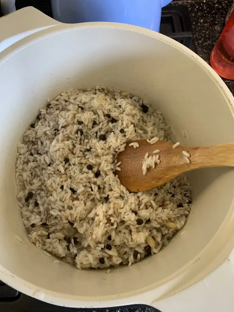 Pilavı pişirmek için öncelikle pilav tenceresine tereyağı ve sıvı yağ alınır. Yağlar eriyince suyu süzülen pirinçler eklenerek kavrulur.2-3 dakika kavrulduktan sonra dolmalık fıstıklar ve kuş üzümleri ilave edilir.Beraber bir iki defa karıştırılarak kavrulur.