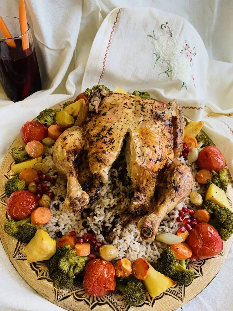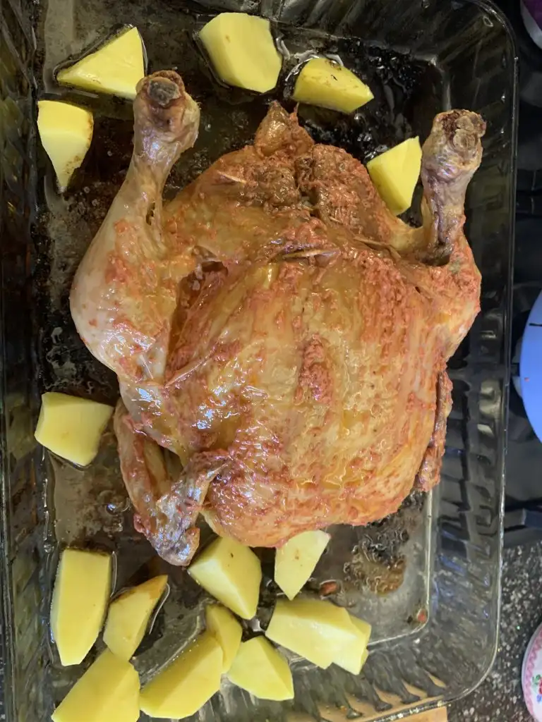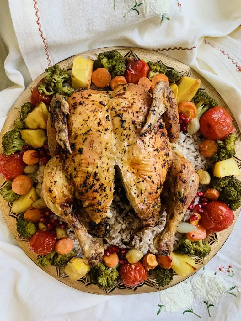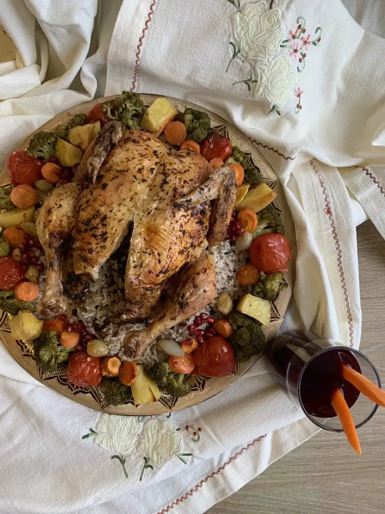 Diğer taraftan bütün tavuğumuz yıkanır.Tavuğun içi fazla bastırmadan pilavla doldurulur. Çok sıkıştırırsanız pilavınız hamur olabilir.Tavuğun ayakları ya derisinden geçirilerek sıkıştırılır veya kürdanla güzelce tutturulur ben kürdanla tutturdum, böylece pişerken açılması önlenmiş olur. Daha sonra tavuk ve havuç domates arpacık soğanı yağlanmış fırın kabına alınarak 185 derece fırında 60 dakika kadar pişirilir. Garnitürleri yumuşayınca fırından aldım tam 60 dk beklemedim onlar için.