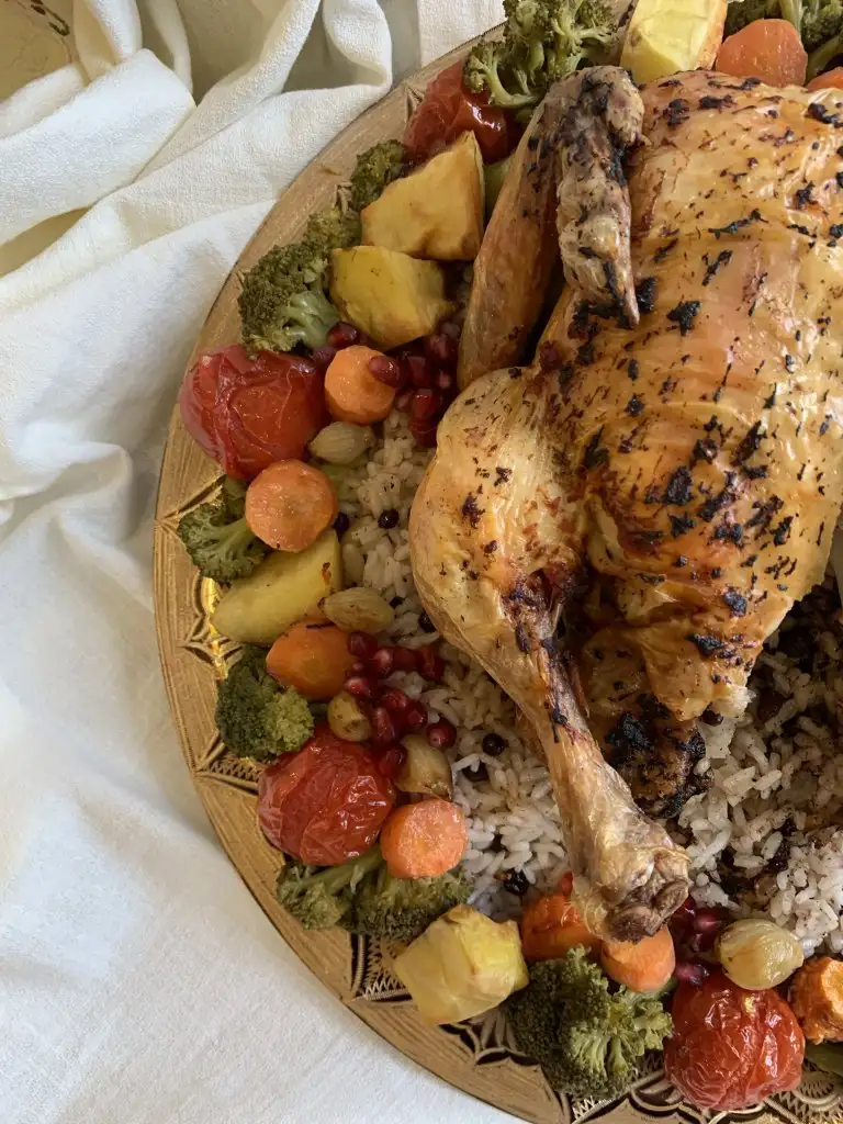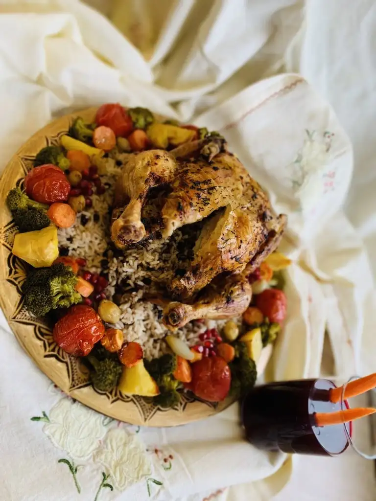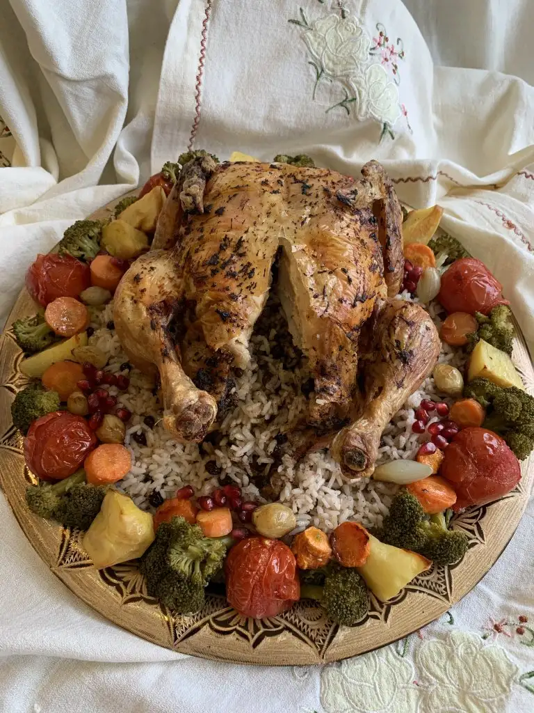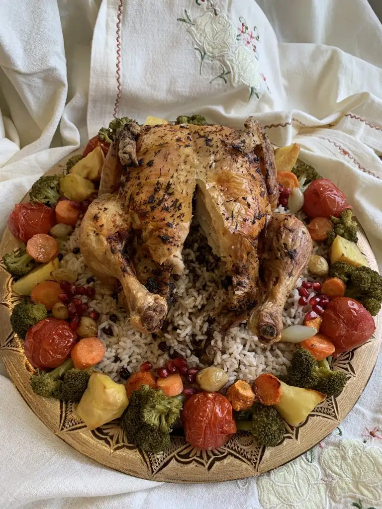 Diğer taraftan bütün tavuğumuz yıkanır.Tavuğun içi fazla bastırmadan pilavla doldurulur. Çok sıkıştırırsanız pilavınız hamur olabilir.Tavuğun ayakları ya derisinden geçirilerek sıkıştırılır veya kürdanla güzelce tutturulur ben kürdanla tutturdum, böylece pişerken açılması önlenmiş olur. Daha sonra tavuk ve havuç domates arpacık soğanı yağlanmış fırın kabına alınarak 185 derece fırında 60 dakika kadar pişirilir. Garnitürleri yumuşayınca fırından aldım tam 60 dk beklemedim onlar için.