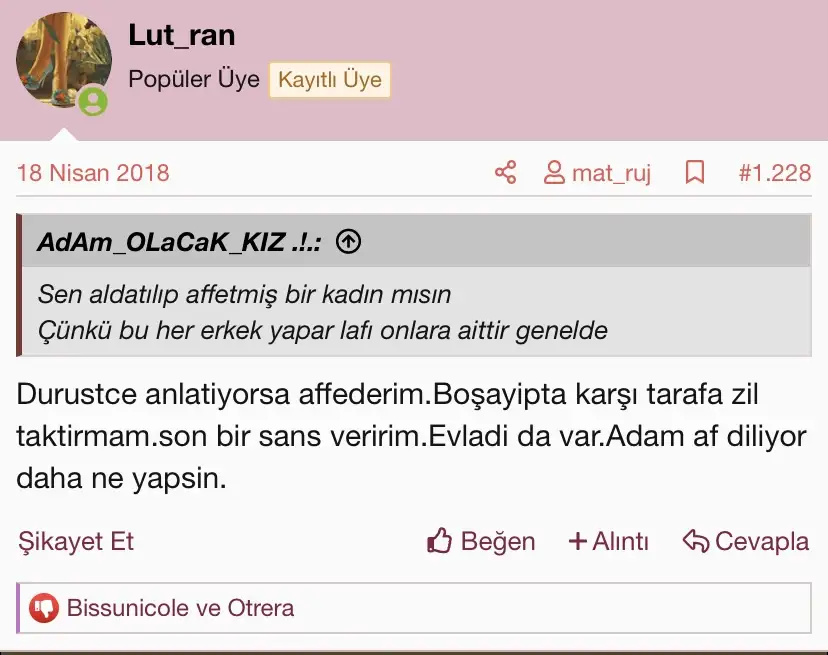 Benim konumda karısından af dileyen bir adam yok. Bırak yakamı artık kadın diyen ve boğulan mutsuz olan bi adam var. Konular çok farklı. Ben son bir şansa inanırım. O yüzden yazmışımdır o yorumumu da.