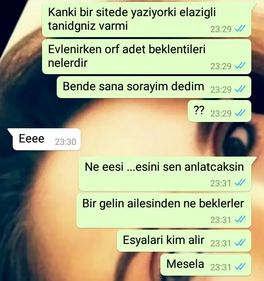 Benim erkek arkadaşım baba tarafından Elazığlı, anne tarafı Bursalı. Ciddi düşündüğümüz bir ilişkimiz var, bir aksilik olmazsa seneye evlenmeyi düşünüyoruz. Birbirimizin aileleri ile tanıştık ama aileleri tanıştırmadık. Neyse, işte plan yapıyorduk ne yaparız ne ederiz, benim oturduğum evimdeki eşyalar vesaire muhabbeti ediyorduk. Birden erkek arkadaşım şey dedi "Astoria biz Elazığlıyız bak annem babam çok takmaz da büyükler biraz adet gelenek görenek bekler korkma tamam mı?" dedi. "Neyinden korkacağım, ne gibi adetleriniz var ki?" dedim. "Var bir şeyler işte" falan dedi ama bahsetmedi yani, espri mi yaptı anlamadım ki. Google'a "Elazığ evlenme gelenekleri, düğün adetleri" ne bulduysam yazdım ama garip garip şeyler çıktı.Gülmeyin ehehe anlatmayınca kıllandım ne yapayım.
